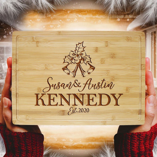 Personalized Christmas Cutting Board with Bells and Holly Design