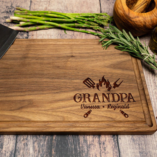 Personalized Grandpa BBQ Cutting Board with Family Names and Grill Tools